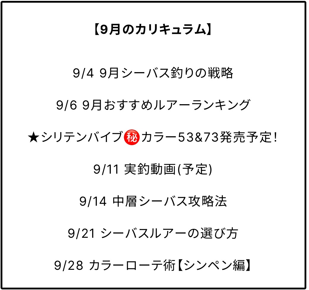 9月の戦略授業、おすすめルアーランキングで今月のシーバス釣り戦略の軸を固めて頂き、実釣動画で具体的な釣り方を見て実釣に活かしてください!